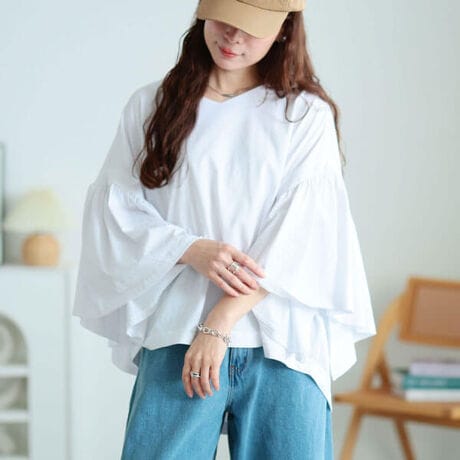 ニュアンシーな落ち感纏う、ギャザーフレアスリーブコットンプルオーバーすっぽり体型が隠れるゆったりシルエットでぽっちゃり体型なかったことに!自然に脚長見えする前後差着丈で気になるヒップラインもしっかりカバー◎ドロップショルダーから贅沢に広がるフレアスリーブで華やかに二の腕を隠してくれる♪好みのボトムスに合わせるだけで日常〜お出かけまで大活躍☆
