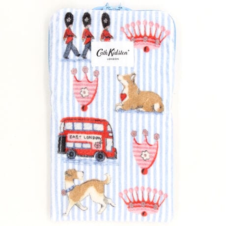 500mlペットボトルが入るサイズ感。そのほかにも細かい物の持ち運びにも便利です。タオル素材で手触りが良く、丸洗い出来ます。近衛兵やロンドンバス、王冠モチーフなど、ロンドンを代表するモチーフを動物と組み合わせ、優しいタッチで描き上げた、キャス キッドソンらしい柄がプリントされています。