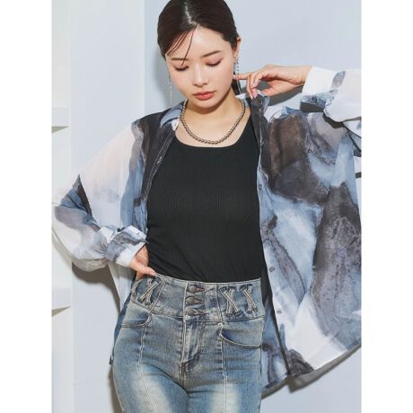 モノトーンアート柄プリントシフォンシャツ