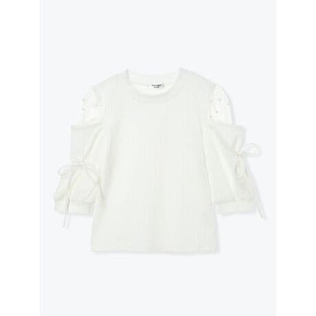 [型番:26550729543]チュール切り替えにパール調を散りばめたデザインが魅力的なプルオーバー。スリーブにはリボンをあしらっており、ガーリーなアクセントになります。肌触りの良いテレコ素材が着心地の良さを実現。どんなボトムスにも合わせやすく、着回しの幅が広がるアイテムです。