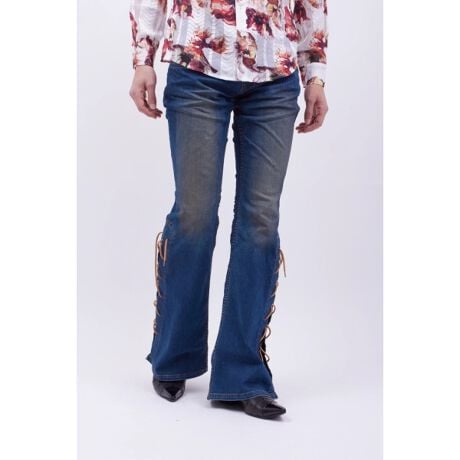ヴィンテージライクなブルー加工デニムに、レースアップデザインを裾にオン。カジュアルながらもボヘミアンな魅力を放ち、今期のブランドテーマを凝縮した一本です。
