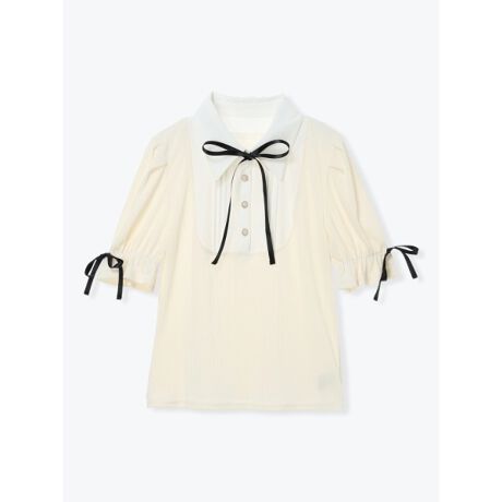 リボン付きシャツレイヤード風トップス
