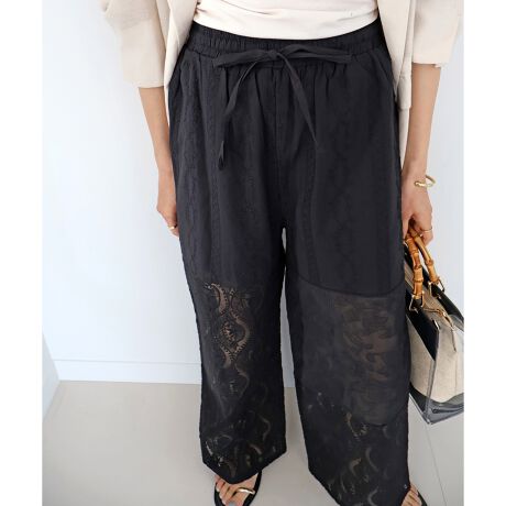 柄の異なるレースファブリックをドッキングした、存在感のあるデザインパンツ。