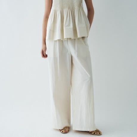 ・ハリのある素材感で肌に張り付きにくく、汗ばむ季節も涼しく快適に穿けるワイドパンツ。