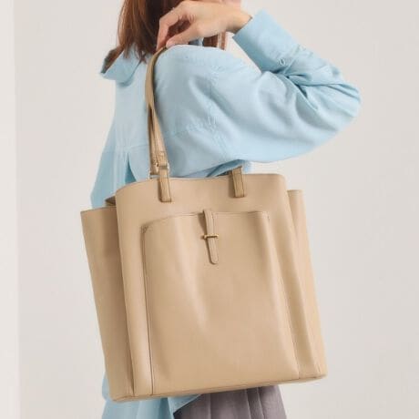 シンプルで上品な合成皮革仕上げに、さりげないゴールド金具をあしらったミニマルデザイン。