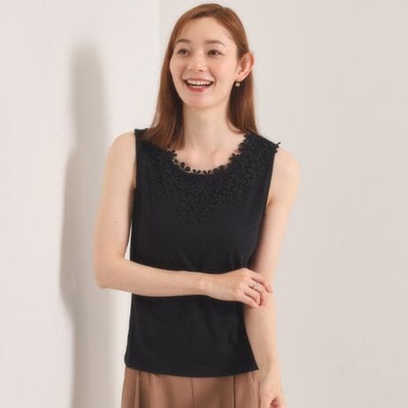 胸元に華やかなレースをあしらったデザインで、シンプル過ぎずコーディネートのアクセントになります。
