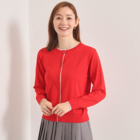 レイヤード風の配色デザインが今っぽさのあるニットカーディガン。