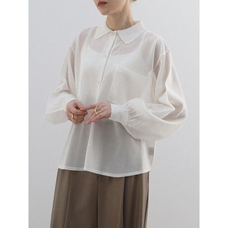 ほんのり透ける軽やかさが、スタイリングに自然な奥行きと抜け感を与えるシアーシャツ。袖口はリブでシルエットでメリハリをつけ、丸みを帯びたややボリュームある袖が女性らしい印象に。ゆとりのあるシルエットとミニマルなデザインが、大人らしい余白を演出。一枚ではもちろん、インナーとのレイヤードも楽しめる、着回し力の高いアイテムです。