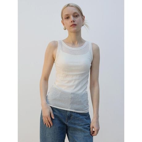 素肌に溶け込むような、繊細なシアー感が魅力のタンクトップ。ミニマルなデザインだからこそ、レイヤードにも一枚着にも活躍。コンパクトで優しく身体にフィットするストレッチ性も魅力。同素材のカットソーとのレイヤードスタイルはもちろん、単品使いでジャケットやシャツのインナーとしても映える、大人のためのベーシックアイテムです。