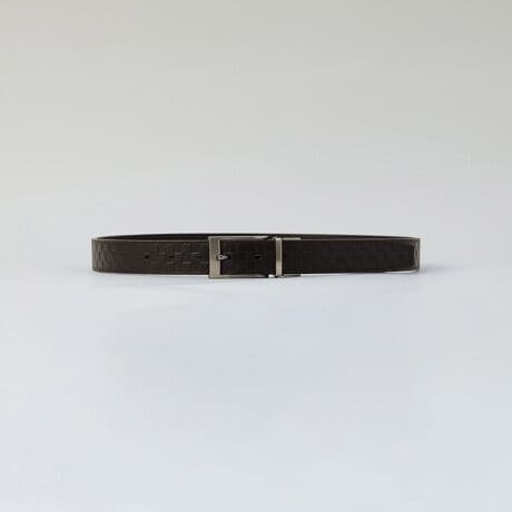 [型番:07-63YO01-206]《デザイン》定番市松リバーシブルベルトのリニューアルです。帯は裏表、牛革にアップデートしました。汎用性の高いシンプルで癖のないバックルにしています。《素材》厚みがあり、丈夫な成牛の革(ステアレザー)に、市松柄の型押しを入れた素材です。艶感があり、経年により柔らかくなじむのが特長の素材です。裏面はシュリンク(シボ)の型押しを入れた、しわや傷が目立ちにくい特長がある革です。