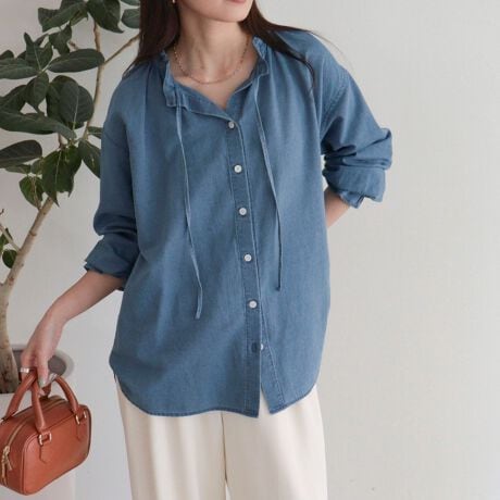 フリルカラーが大人可愛いデニムブラウス