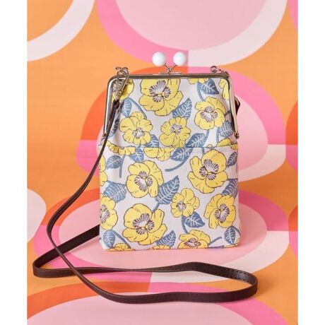 [型番:7JMP6105-2026]春の花々をモチーフにした、昭和モダンな雰囲気漂う玉付きがま口。ミモザやポピー、パンジーなど季節の彩りを上品に描いたデザインが魅力です。スマホや御朱印帳が収まるサイズ感で、外ポケット付きなのも便利。丸玉の留め具が可愛らしく、普段使いからお出かけ、和装コーデにも映える上品なデザインです。