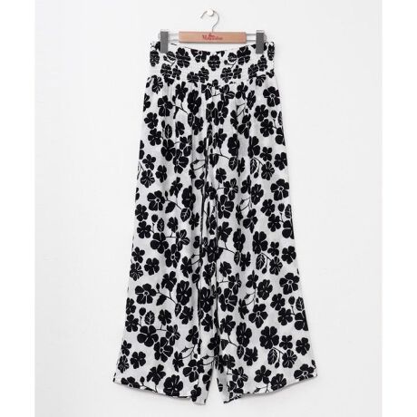 [型番:YIA-6103-2026]繊細で高貴な花、イリマをキュートに散りばめ、 上品にデザインされた巻きスカート仕様のパンツ。シャーリングのウエスト、軽くてエアリーな素材でストレスフリーな着用感です。踏み出す度に風を受けて膨らむワイドシルエットが美しく、真夏でも涼しくご着用いただけます。