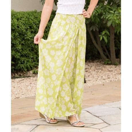 繊細で高貴な花、イリマをキュートに散りばめ、 上品にデザインされた巻きスカート仕様のパンツ。シャーリングのウエスト、軽くてエアリーな素材でストレスフリーな着用感です。踏み出す度に風を受けて膨らむワイドシルエットが美しく、真夏でも涼しくご着用いただけます。