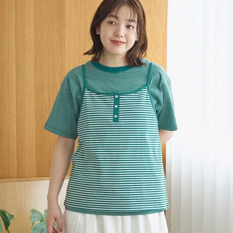 Tシャツと前ボタンのヘンリーネックキャミがセットになった旬アイテム。