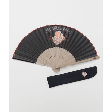 [型番:7XCP6104-2026]ユニークな和の顔をモチーフにしたプリントが目を引く和面扇子。持ち運びに便利な専用袋付きで、親骨にはカヤオリジナル刻印が入っています。遊び心あふれるデザインは贈りものにもおすすめです。