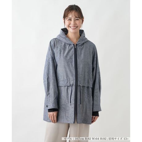 タウンエレガンスを追求した、ハイクラスな羽織り心地のジャコット(ジャケットコート)です。薄手のダンガリー風生地にモチーフ柄をボンディング(貼り合わせ)し、モチーフ部分のみを二重にすることで生まれる美しい透かし柄が、大変優雅な印象を与えます。ウエストを絞ることでシルエットに変化をつけられ、その日の気分やお召し物に合わせてスタイルをアレンジ可能。軽やかに羽織れる緩やかなシルエットは、春から初夏にかけての散策やご旅行にも最適で、大人の余裕を感じさせる逸品です。