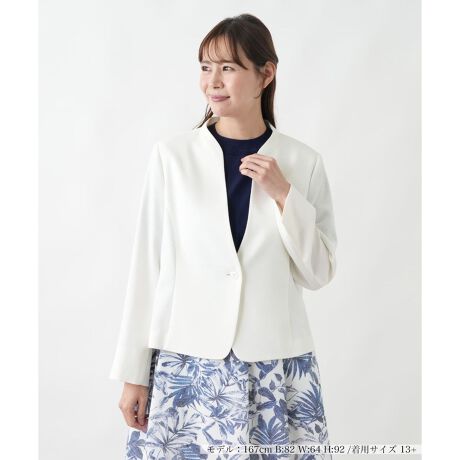 上品な光沢と立体的な風合いが魅力の、特別な日のためのジャケットでございます。後ろ衿を立たせた変形カラーが、お顔周りを華やかに演出し、V開きのシルエットや丸みを帯びた衿と裾のデザインが、優雅で女性らしい印象を与えます。繊細なヘリンボーン柄をジャカード織りで表現し、控えめながらも高級感あふれる光沢を実現。伸縮性に優れた素材で、フィット感と動きやすさを兼ね備え、長時間の着用でもストレスを感じさせない着心地です。セレモニーなどの大切な場面に、自信を持って臨める一着です。