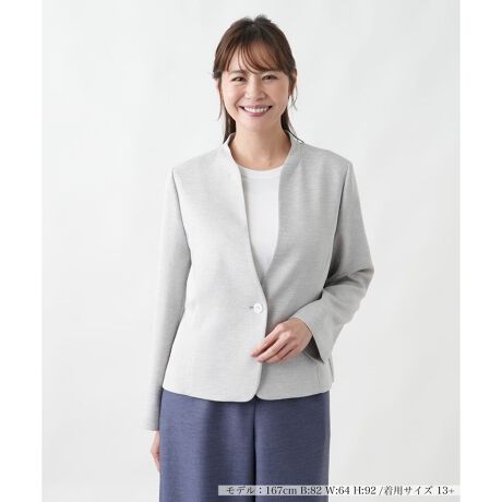 上品な光沢と立体的な風合いが魅力の、特別な日のためのジャケットでございます。後ろ衿を立たせた変形カラーが、お顔周りを華やかに演出し、V開きのシルエットや丸みを帯びた衿と裾のデザインが、優雅で女性らしい印象を与えます。繊細なヘリンボーン柄をジャカード織りで表現し、控えめながらも高級感あふれる光沢を実現。伸縮性に優れた素材で、フィット感と動きやすさを兼ね備え、長時間の着用でもストレスを感じさせない着心地です。セレモニーなどの大切な場面に、自信を持って臨める一着です。