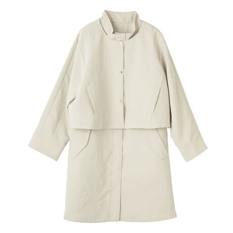 ロングジレとショート丈ジャケット、それぞれ単品でもお召しいただける、着こなしの幅が広がる3WAYコート。2枚重ねのレイヤードデザインでありながら、特殊な中空糸を使用することで、見た目からは想像できないほどの軽やかさを実現しました。麻を思わせるナチュラルで上品な風合いが、初夏の装いに爽やかさをプラス。優しいクリームカラーが、お顔周りを明るく見せ、春らしい雰囲気を演出します。気分やシーンに合わせて様々なスタイルをお楽しみいただける、大変重宝する一着です。