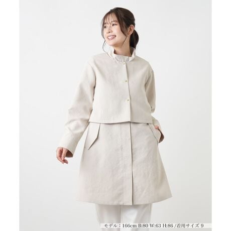ロングジレとショート丈ジャケットを重ねた、3WAYで着こなしを楽しめるレイヤードコート。中空糸を使用することで見た目よりも軽く、重ねて着ても重さを感じにくいのがポイントです。さらりとした風合いと優しいクリームカラーが初夏らしい一着。それぞれ単品でも着回しがきき、様々なコーディネートが楽しめます。