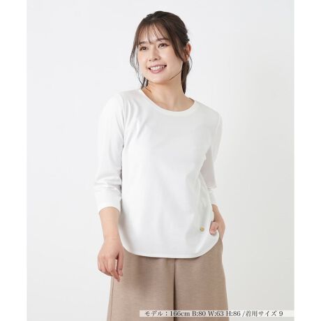 和歌山県の「KANEMASA」社が手掛けるジャージー素材を使用した七分袖インナー。適度なハリと光沢感が、上品な表情を感じさせます。脇にタックを入れた立体的なシルエットで、身体のラインを拾いにくいのも嬉しいポイント。カジュアルはもちろん、きれいめな場面でも活躍する着回し力の高い一枚です。