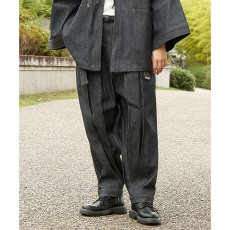 [型番:74H-6102-2026]野良着とカルサン袴から着想を得たデニムパンツ。岡山産のリジットデニムを使用し、穿くほどに柔らかく馴染む育てるデニムとして仕立てました。補強リベットや真田紐のあしらいがポイントで、丈夫さと伝統の意匠を両立しています。扇子ポケットなど実用性にも優れ、長く愛用できる国内生産の一着です。
