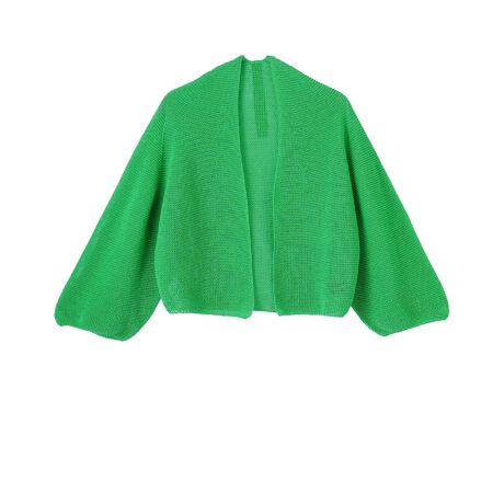 ホールガーメントで編み上げられたボレロは、無縫製ならではの滑らかな着心地と美しいシルエットが魅力です。シアーなメッシュ編みが軽やかな表情を演出し、程よい透け感がスタイリングに奥行きと品を添えます。肌寒い時や日差しが気になる時にさっと羽織れ、季節の変わり目にも活躍。いつもの装いに洗練された印象をもたらす一着です。