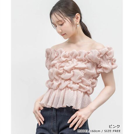 シャーリングの立体感が愛らしい、今季注目のクロップド丈オフショルダートップス。