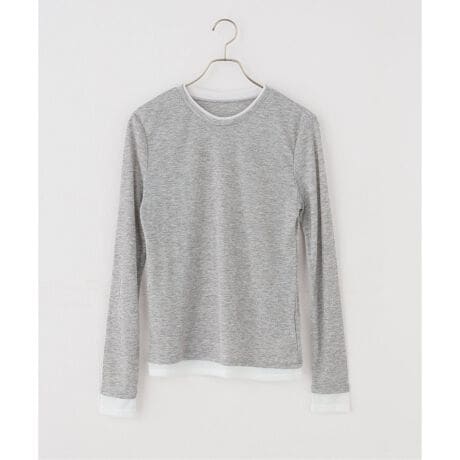 襟ぐりと袖口を二重に仕上げ、二枚を重ねて着ているようなデザインが特徴の一枚。さりげないレイヤードディテールが、シンプルながらもこなれた印象を演出します。