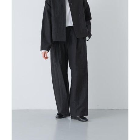 あらゆるシーンに寄り添うきれい目なボトムが届きました。フロントのタックが立体感を生み、ワイドながらもどこかスッキリとしたストレートシルエット。ウエストはゴムで楽な着心地なのに、上品かつ抜け感のある佇まいがぐっとお洒落な雰囲気に。同素材のジャケットを合わせればオケージョンにも活躍します。