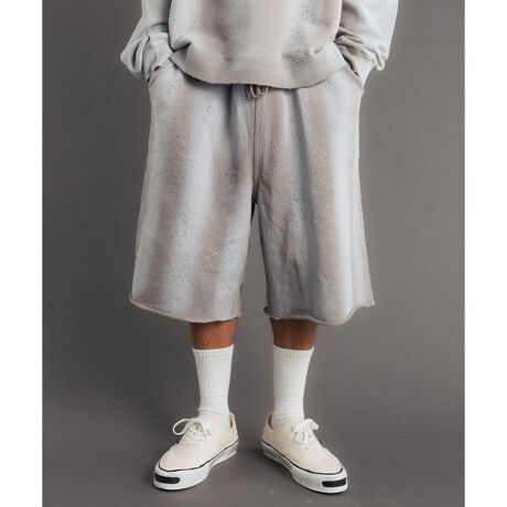 ムラ感のある染め加工を施したスウェットショーツに、全体的にラインストーンを散りばめた存在感のある1本。