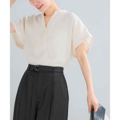 落ち感のある滑らかな素材は、触れるたびに心地よい冷たさを感じる接触冷感機能付き。日差しが気になる季節に嬉しいUVカット効果も備わり、お出かけの日も心強い一枚です。首元をすっきりと見せるスキッパー風のバンドカラーが、都会的で知的な印象を与え、ゆとりのあるフレンチスリーブとサイドスリットにより、体のラインを拾わず軽やかに着用可能。フロントに施された細身のメタルパーツが、控えめながら上品な輝きを添えています。同素材のパンツと合わせれば、オフィスにも最適な清潔感のあるスタイリングに。スカートにフロントインして、ふんわりとしたシルエットを楽しむのもおすすめです。