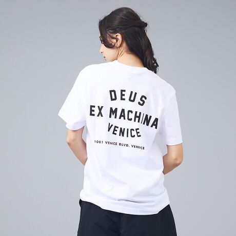 背面に配置された目を引く「DEUS EX MACHINA VENICE」のバックプリントが特徴。コットンジャージのクルーネックの半袖ボディで、ややリラックスしたボックスシルエットでデイリーに合わせやすい一枚。