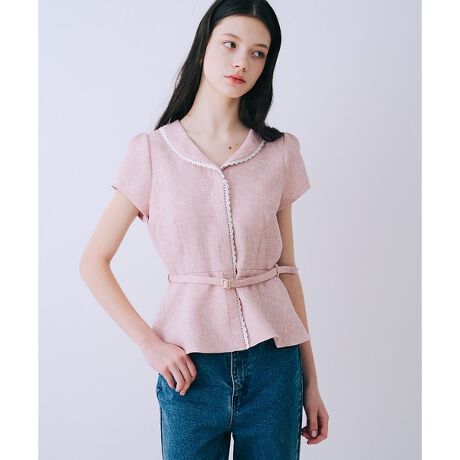 ツイードベルト付半袖ペプラムブラウス【予約】