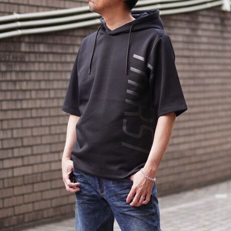 ゆったりとしたシルエットに左右脇を跨ぐプリントが目を引く5分袖フーデットパーカー。羽織のインナーとしても1枚で着ても様になるアイテムとなっています。