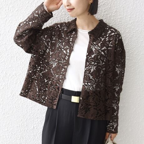 繊細なレースの透け感が楽しめる、シンプルなシャツカラーのレースブラウス。