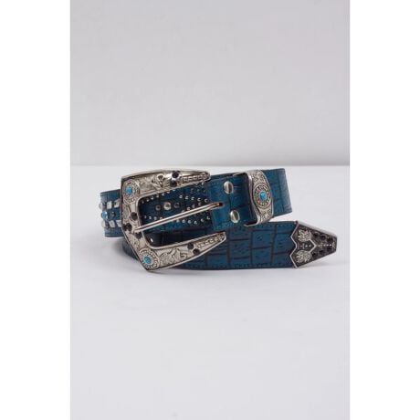 ツートン染めで仕上げたクロコ型押しレザーに、墨入れ加工を施したニッケルバックルを組み合わせ、重厚かつワイルドな印象に昇華。