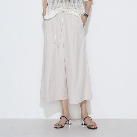キュロットのパターンを用い、フロントに二つのタックとセンタープレスを施すことで、縦のラインを強調したフェミニンなシルエットに仕上げています。