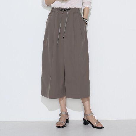 キュロットのパターンを用い、フロントに二つのタックとセンタープレスを施すことで、縦のラインを強調したフェミニンなシルエットに仕上げています。