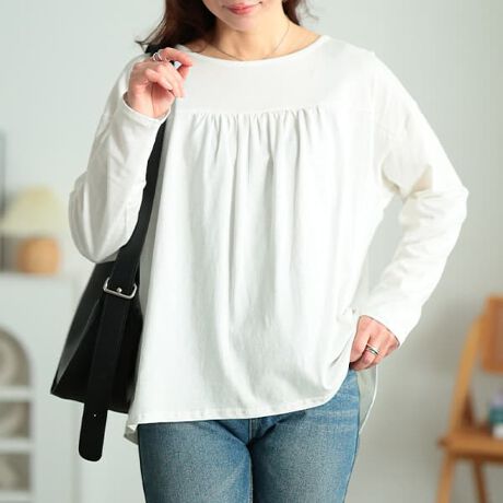 さらりとやわらかく、伸びのあるカットソー生地で仕立てた大人のための上品デザイントップス。前側は胸元に細かいギャザーを施し、気になるバストラインをふんわりカバーしながら、すっきりとした印象に整えてくれます。後ろはドレープが重なったようなレイヤード風デザイン♪背中のラインを自然に包み込み、ヒップまでしっかりカバー◎動くたびに揺れるシルエットが女性らしさを引き立てます♪