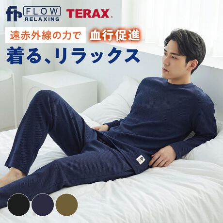"寝ながら、くつろぎながら、、、" というコンセプトから生まれたFlow Relaxingは、日々の暮らしに寄り添い、身体を心地よいリズムへと導くためのウェアブランドです。このブランドが大切にしているのは、特別な準備を必要としない、日常の中での質の高い休息です。その要となるのが、最先端の技術を駆使した高機能素材「TERAX」の採用です。背中や腰といった、一日の終わりに重さを感じやすい部位の裏側には、数種類の天然鉱石をブレンドした生地を使用しております。この素材が身体から放たれるエネルギーを遠赤外線として効率よく活用することで、血行を促進してくれます。本体生地には、独特の凹凸があり、ふっくらとした風合いが魅力のワッフル素材を採用しました。生地の間に空気の層を作ることで程よい保温性を保ちつつ、肌離れも良いため、お家でのリラックスタイムから就寝時まで、季節を問わずさらりと快適な着心地をキープします。伸縮性にも優れており、身体を締め付けから解放するゆったりとしたシルエットが、ストレスフリーな休息時間を叶えます。ただ着るだけで完結するこの新しい習慣は、忙しい毎日を過ごす方の質の高い休養をサポートし、明日をより健やかに、自分らしく迎えるための準備を整えてくれる特別な一着です。