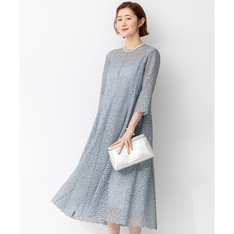 繊細なレースを贅沢に使用した総レースドレス。裾にかけて分量感を出すことで、動くたびに優雅なラインを描くシルエット。インナーのキャミソールワンピースとすこし色差を出すことで、涼し気な立体感が生まれ、品のよさを感じさせるデザインです。カラーは、爽やかな清楚感のあるサックスブルー(#073)、肌なじみよく明るい印象のキャメル(”030)、気品を感じさせるネイビー(#075)の3色展開です。