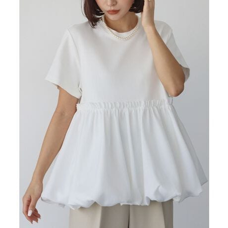 バルーンシルエットが目を惹く異素材ドッキングトップス。