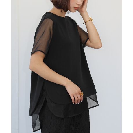 透け感のあるオーガンジー素材で重ね着風のペプラムスタイルを作りました。袖もオーガンジーで抜け感を出しました。