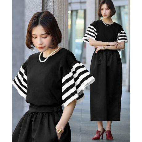 フレアスリーブの総針ニットトップス。