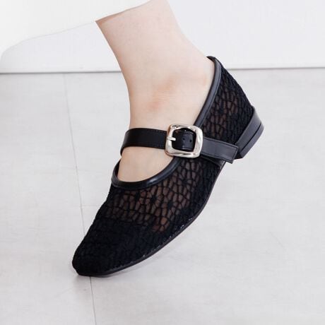 幾何学柄の立体感のあるチュールで遊びを出した抜け感のあるメリージェーンパンプス。