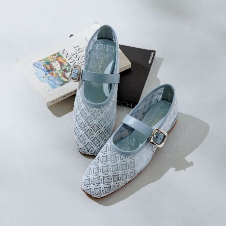 幾何学柄の立体感のあるチュールで遊びを出した抜け感のあるメリージェーンパンプス。