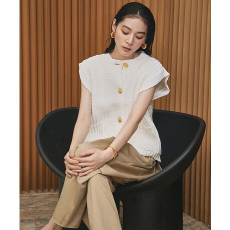 ゴールドボタンが目を惹く、ノースリーブのニットトップスです。