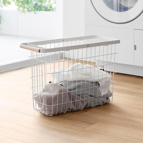 [型番:530563]【デザイン】●幅23cmのスリムなランドリーバスケットLサイズです。●持ち運びに便利なハンドル付きで、天然木のハンドルがアクセントになっています。【スペック】サイズ/約幅23×奥行54.1×高さ36.7cm重量/約1.6kg容量/約33L内容量/1個材質/本体:スチール(ユニクロメッキ+粉体塗装)ハンドル:天然木(ウレタン樹脂塗装)生産国/中国製耐荷重/約4kg(静止荷重)